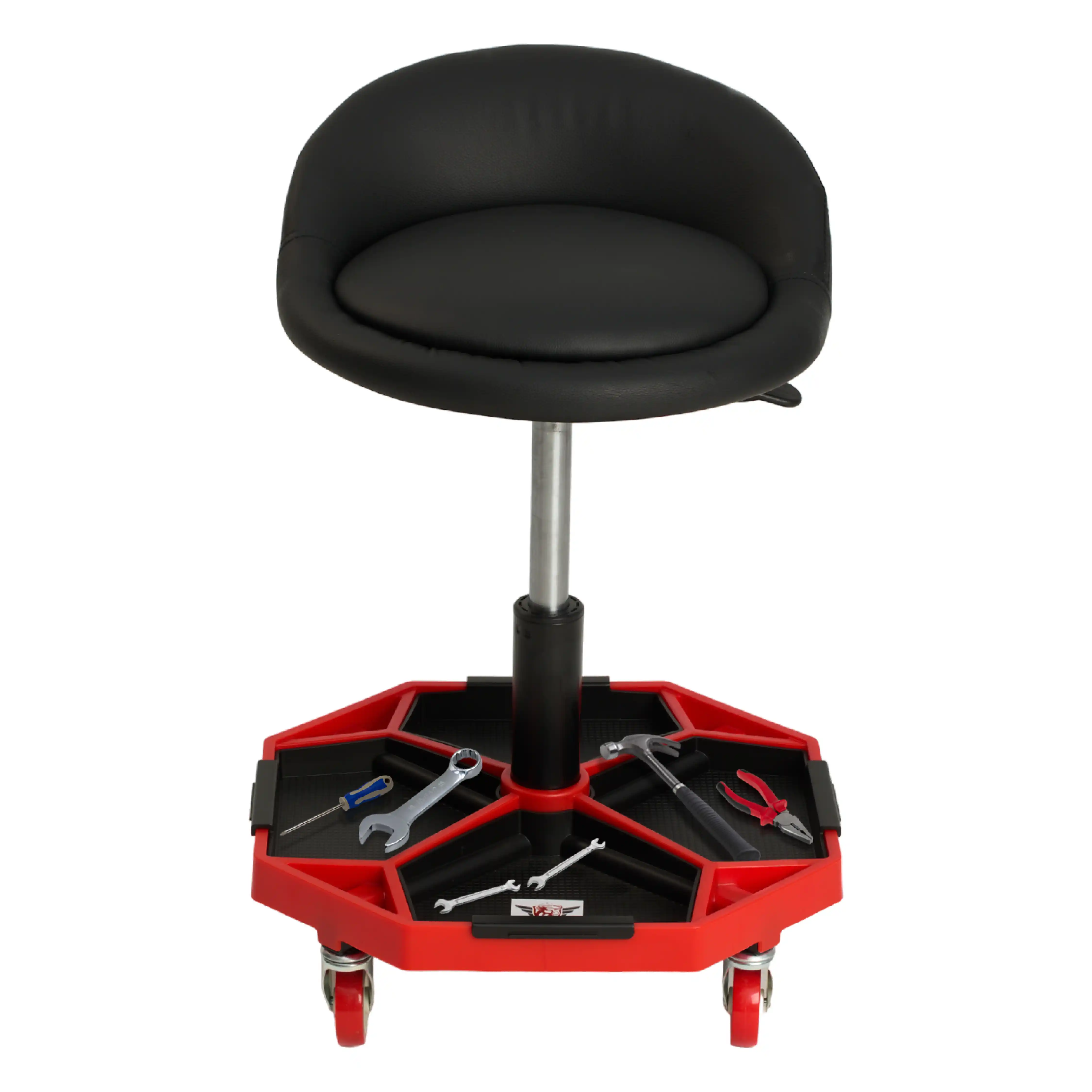 Heavy-duty, adjustable height chair with 360° swivel casters and ergonomic backrest for mechanics and DIY enthusiasts.