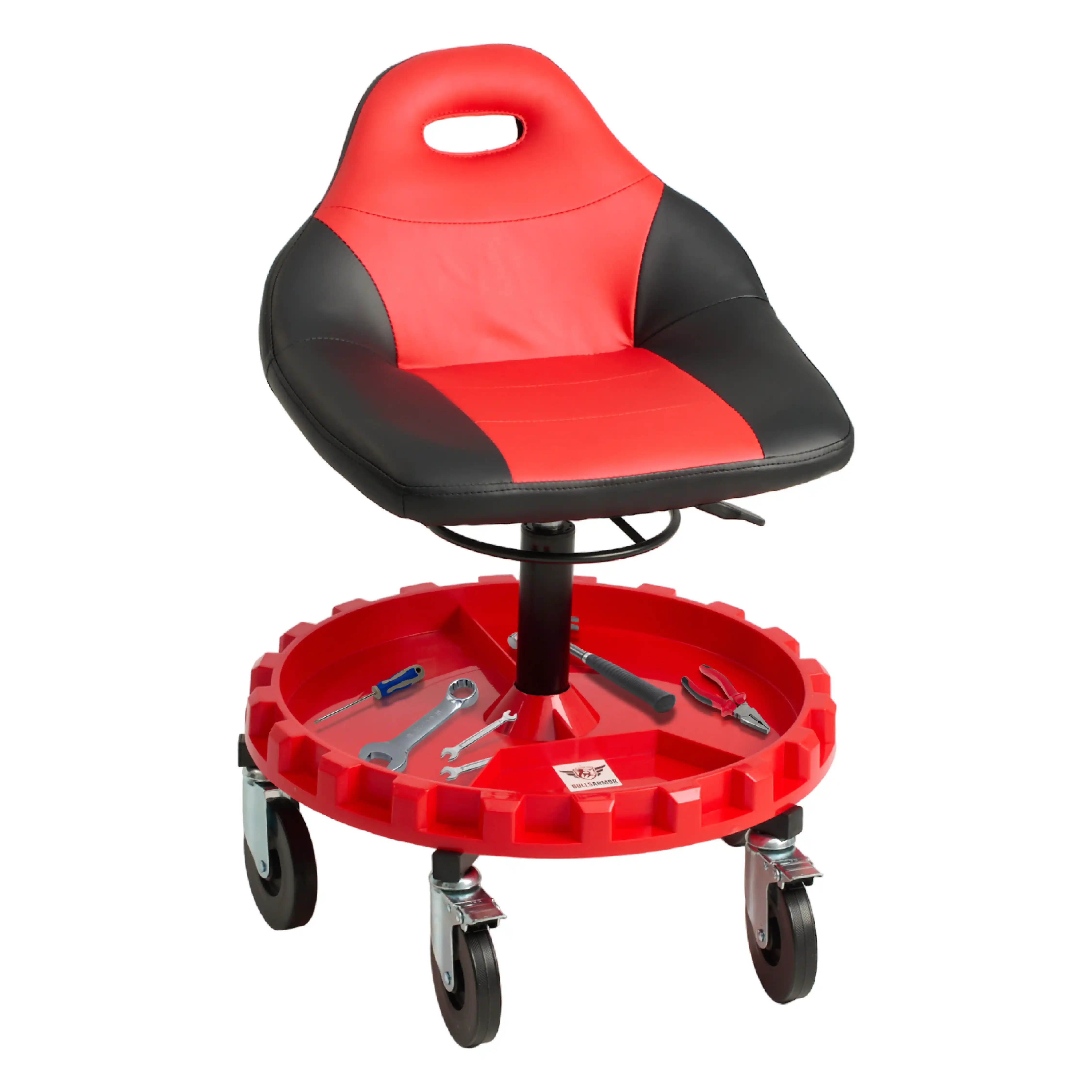 Premium adjustable stool with tool storage and smooth 5" casters for professionals and DIYers, ensuring durability and comfort.