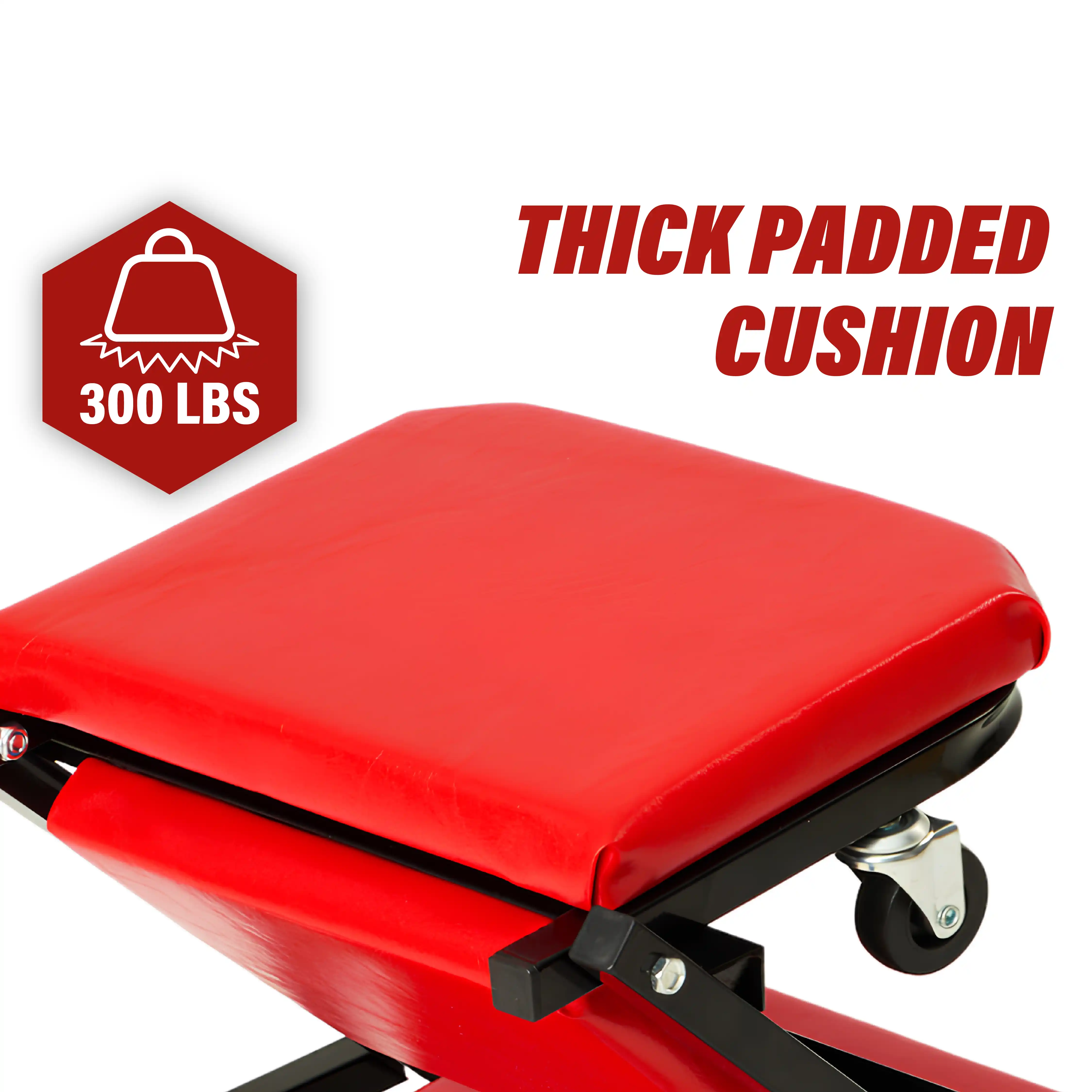 Versatile creeper easily converts to a rolling seat, supporting up to 300 lbs, ideal for comfortable mechanic work.