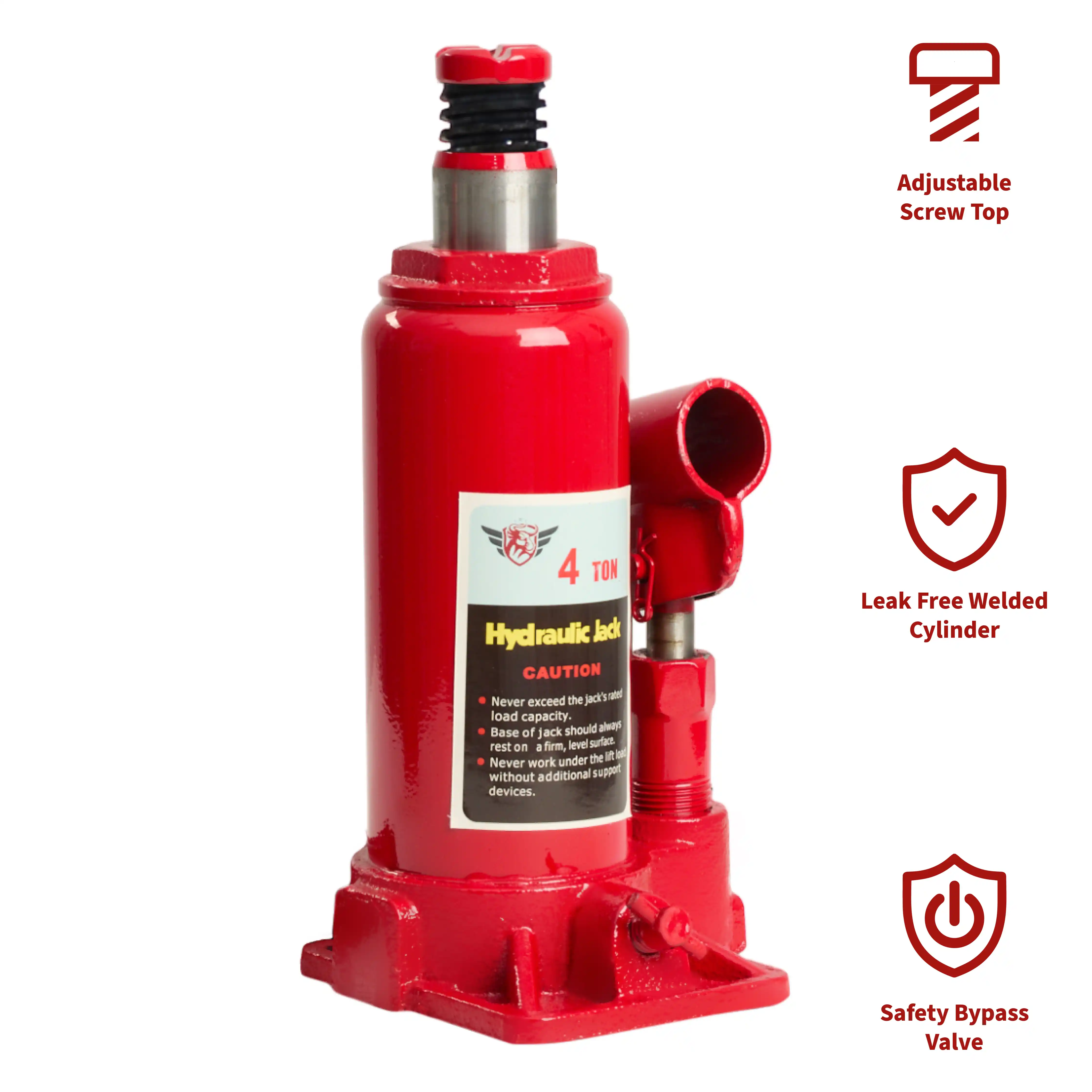 The BullsArmor Hydraulic Bottle Jack is a heavy-duty lifting tool with an 4-ton capacity, suitable for heavy-duty vehicles and industrial tasks. It features a user-friendly pump handle, efficient hydraulic mechanism, durability, leak-resistant design, and a safety valve for added safety.