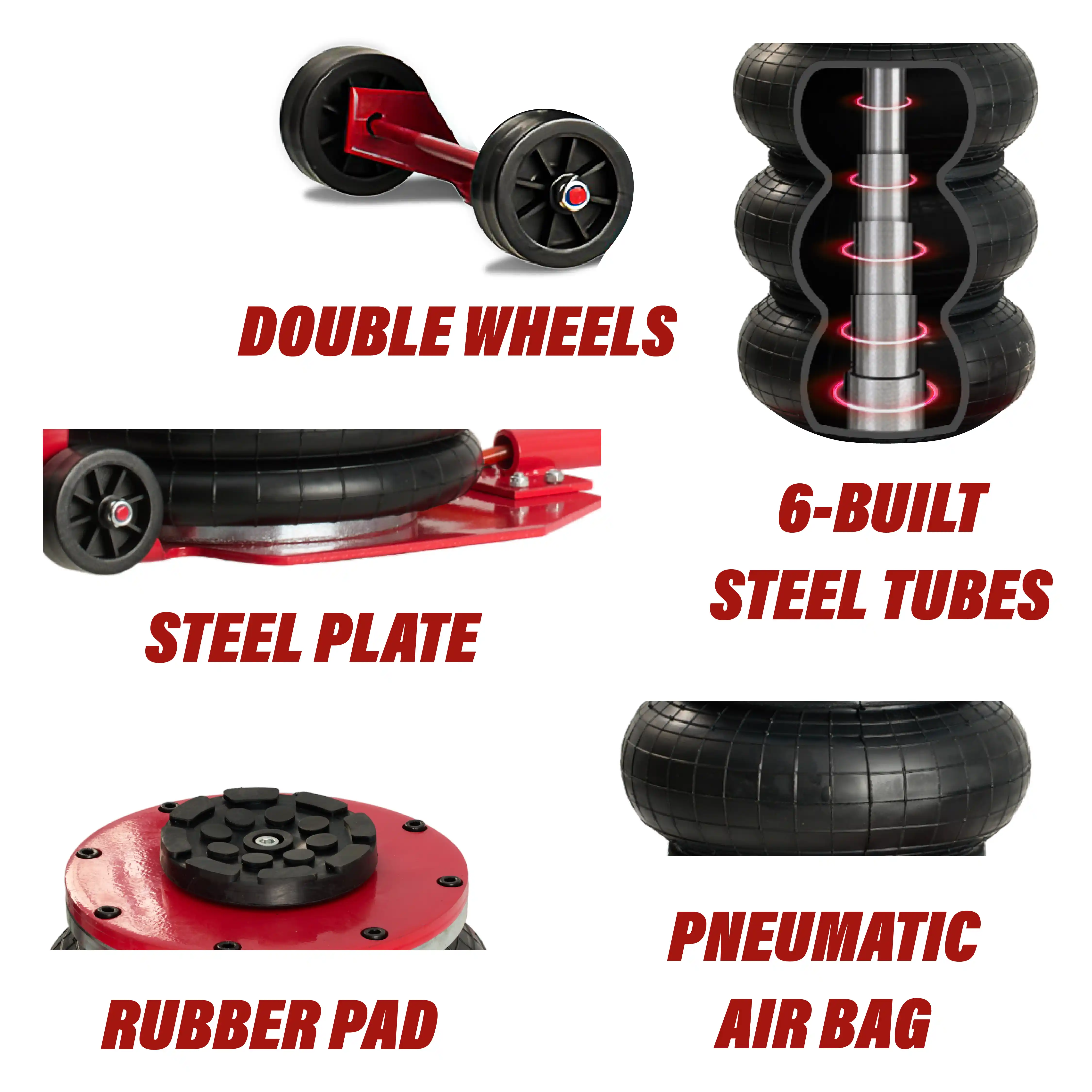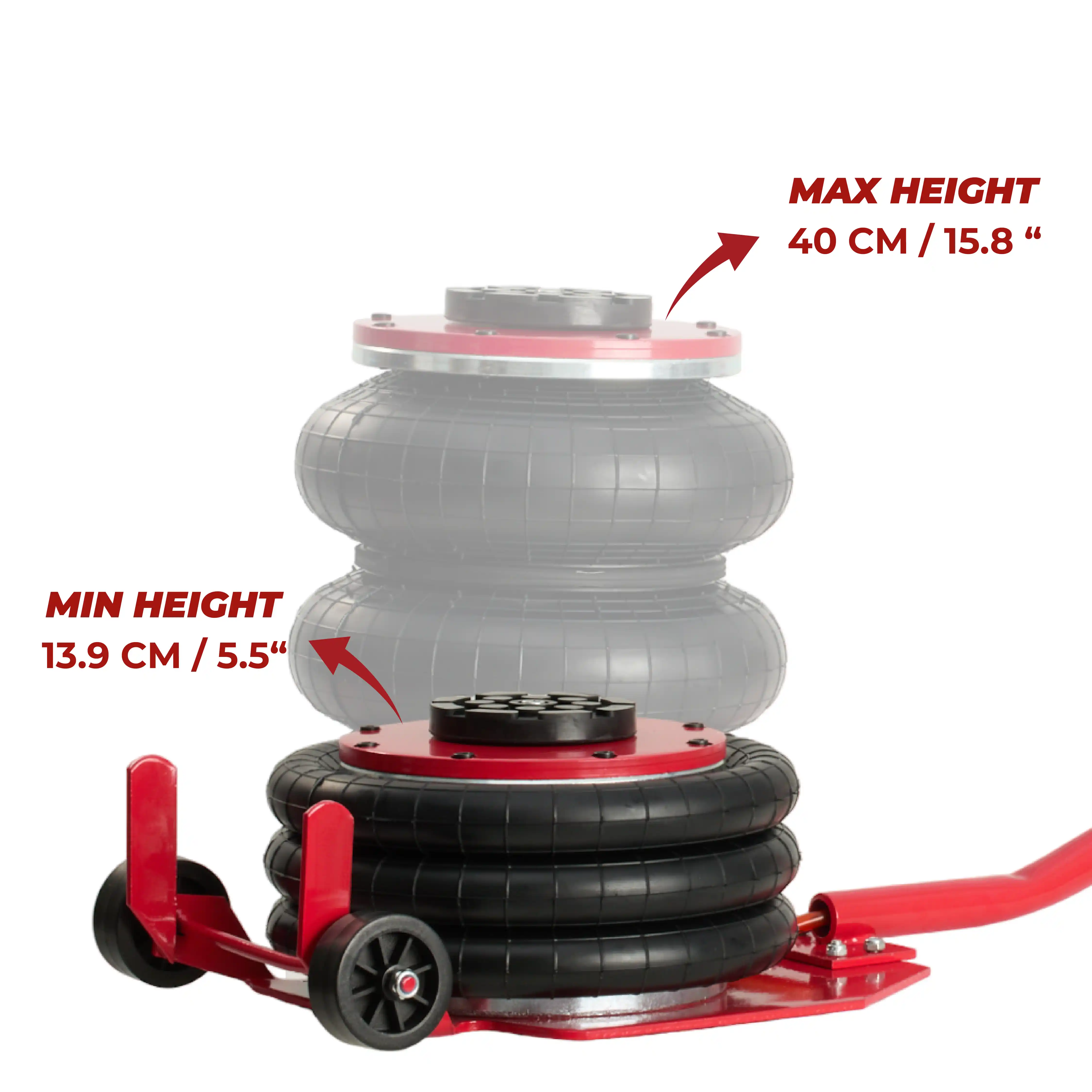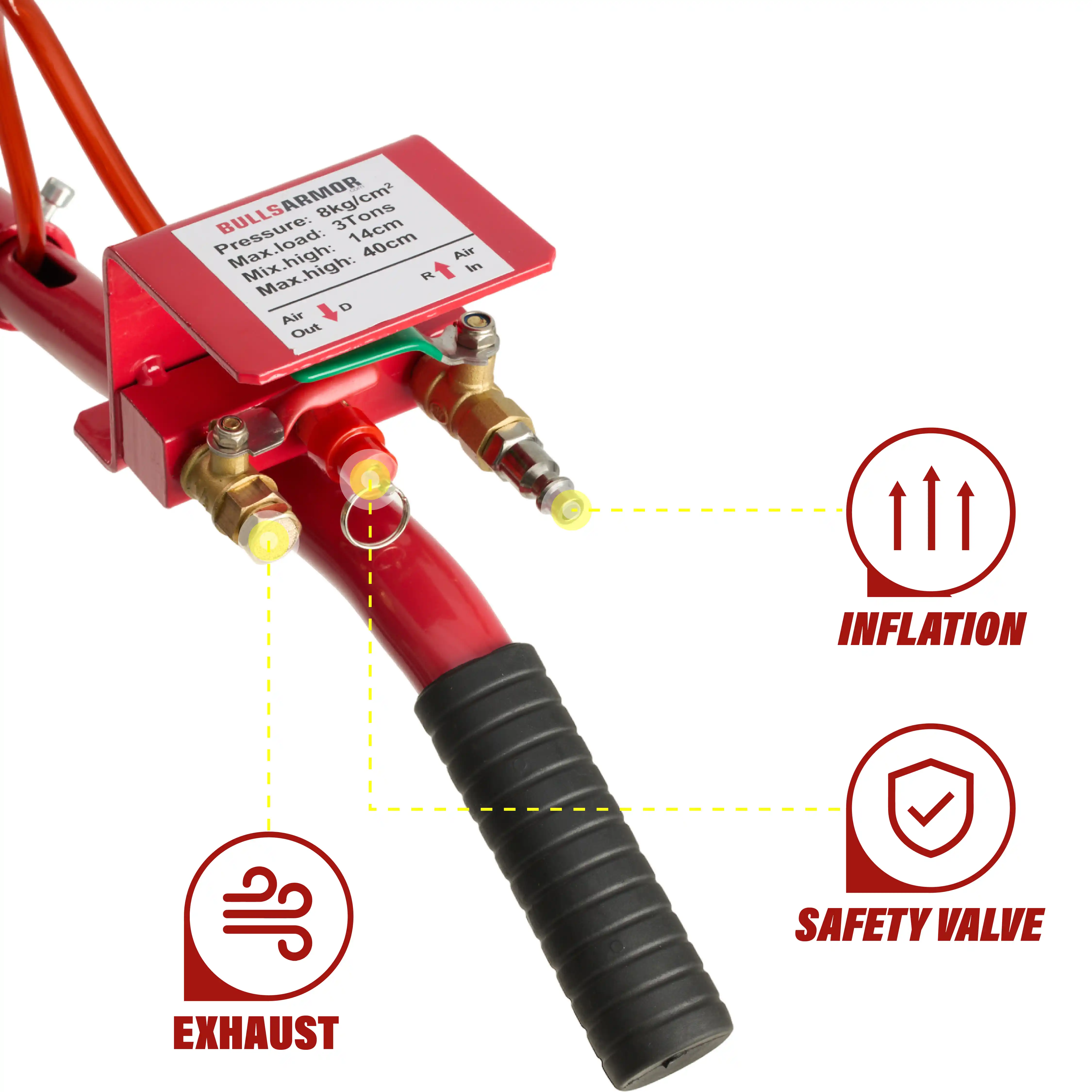 The BullsArmor Air Jack 3 Ton is a versatile vehicle lifting solution with a load capacity of 6,600 lbs. Its high-quality construction ensures durability and reliable performance. Its user-friendly design, compact size, and versatile applications make it ideal for lifting various vehicles and conditions.